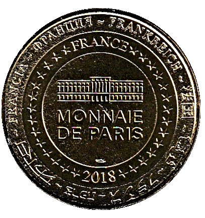 Опис: На периферії слово «Франція» написано вісьмома мовами. Франція на 12-й годині, 2018 рік на 6-й годині, все пов'язано 14 зірками праворуч і ліворуч. У центрі — будівля Монетного двору Парижа.