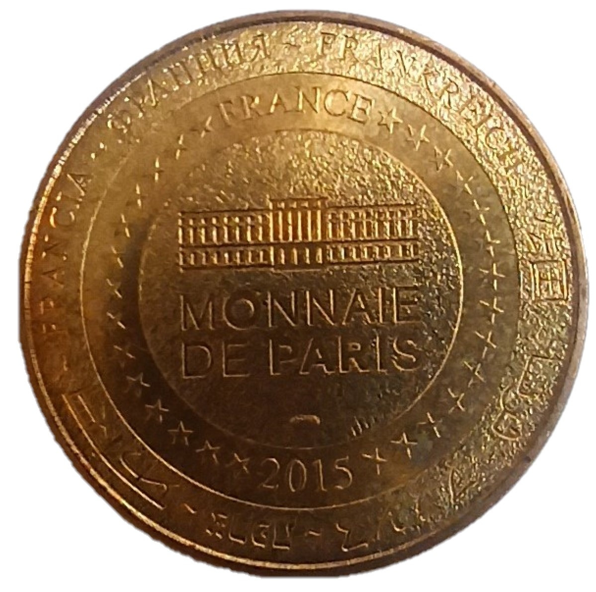 Опис: На периферії слово «Франція» написано вісьмома мовами. Франція на 12-й годині, 2015 рік на 6-й годині, все пов'язане 14 зірками праворуч і ліворуч. У центрі — будівля Монетного двору Парижа.