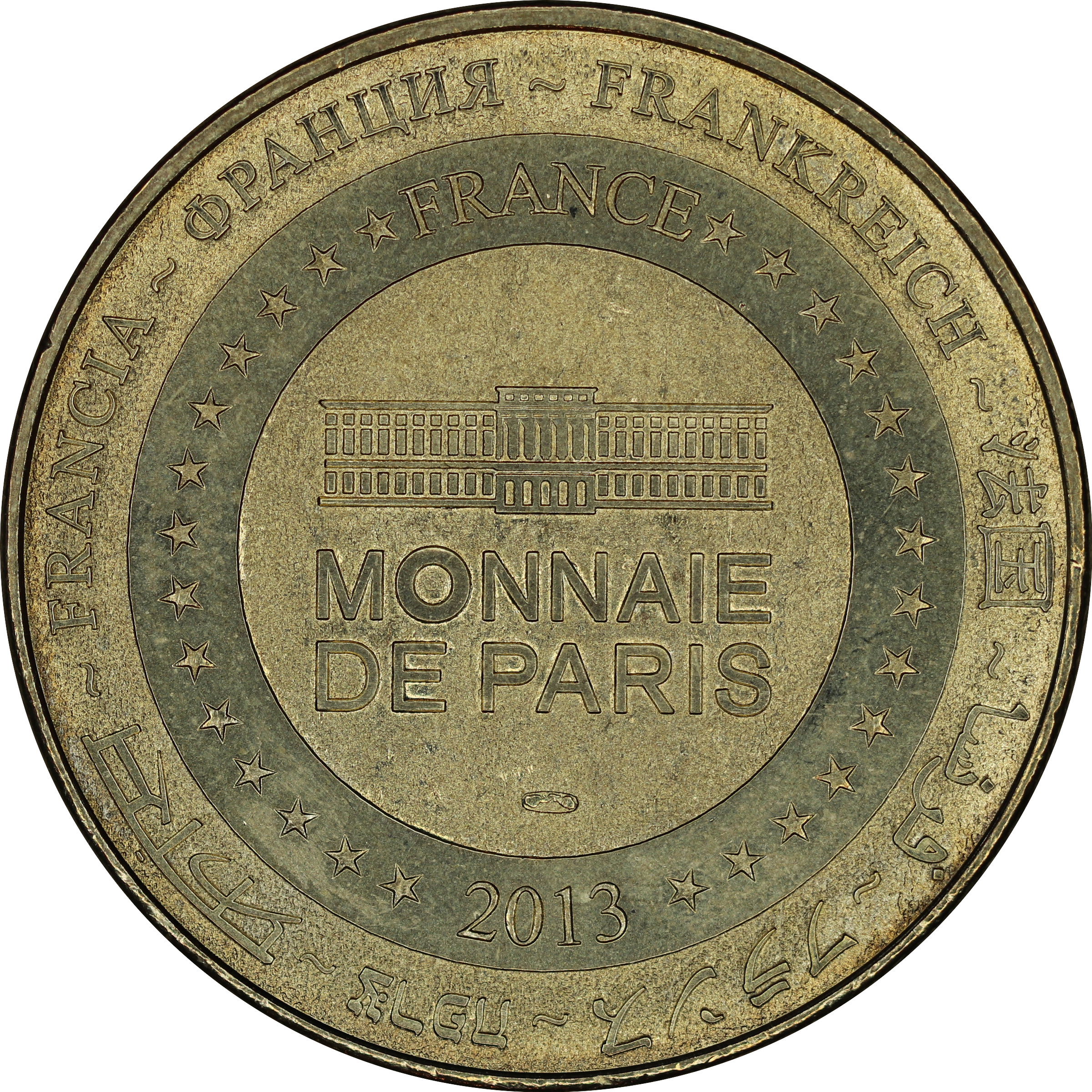 Опис: На периферії слово «Франція» написано вісьмома мовами. Франція на 12-й годині, 2013 рік на 6-й годині, все пов'язане 14 зірками праворуч і ліворуч. У центрі — будівля Монетного двору Парижа.
