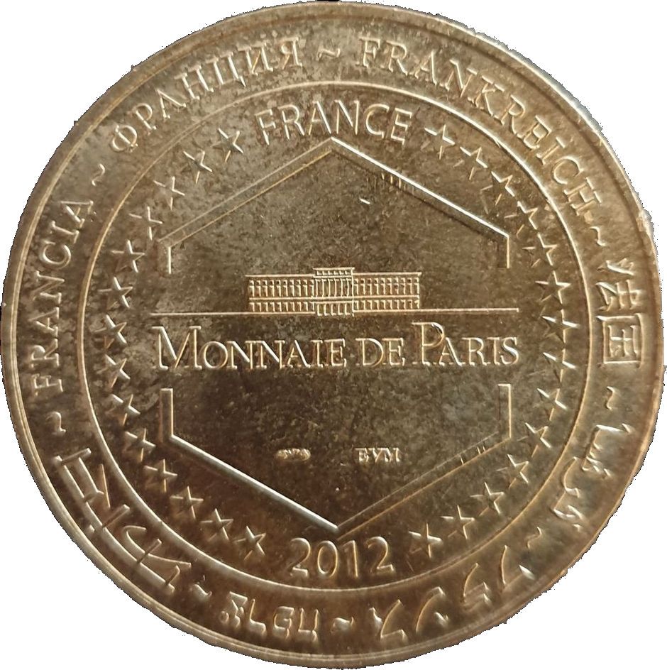 Опис: На периферії слово «Франція» написано вісьмома мовами. Франція на 12-й годині, 2012 рік на 6-й годині, все пов'язано 14 зірками праворуч і ліворуч. У центрі, у шестикутнику, будівля Monnaie de Paris.