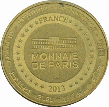 Опис: На периферії слово «Франція» написано вісьмома мовами. Франція на 12-й годині, 2013 рік на 6-й годині, все пов'язано 14 зірками праворуч і ліворуч. У центрі — будівля Моне де Парі.