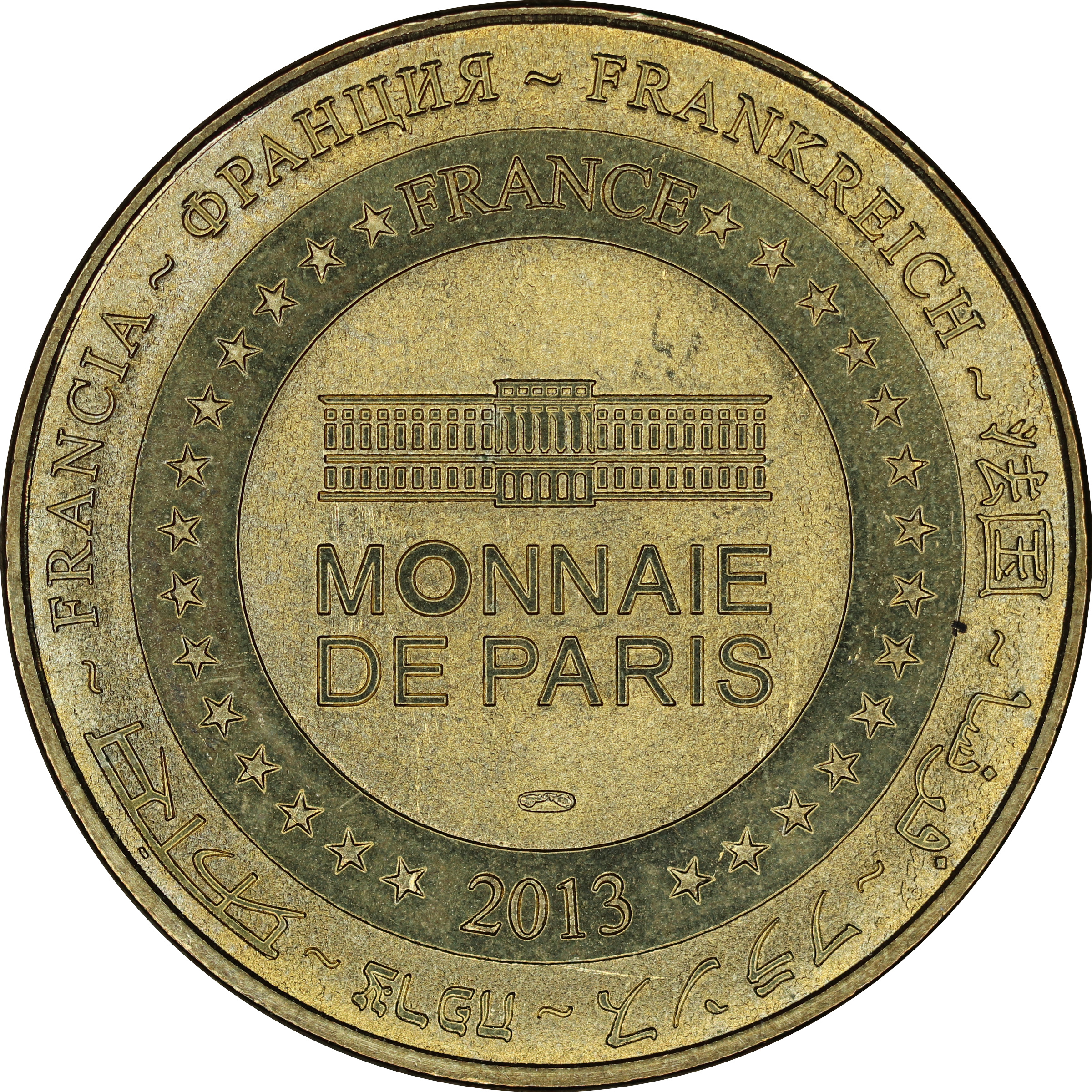 Опис: На периферії слово «Франція» написано вісьмома мовами. Франція на 12-й годині, 2013 рік на 6-й годині, все пов'язане 14 зірками праворуч і ліворуч. У центрі — будівля Монетного двору Парижа.