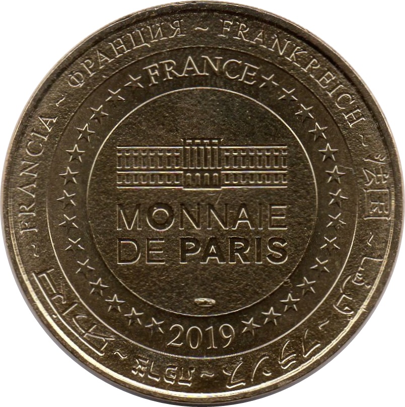 Опис: На периферії слово «Франція» написано вісьмома мовами. Франція на 12-й годині, 2019 рік на 6-й годині, все пов'язане 14 зірками праворуч і ліворуч. У центрі — будівля Monnaie de Paris.