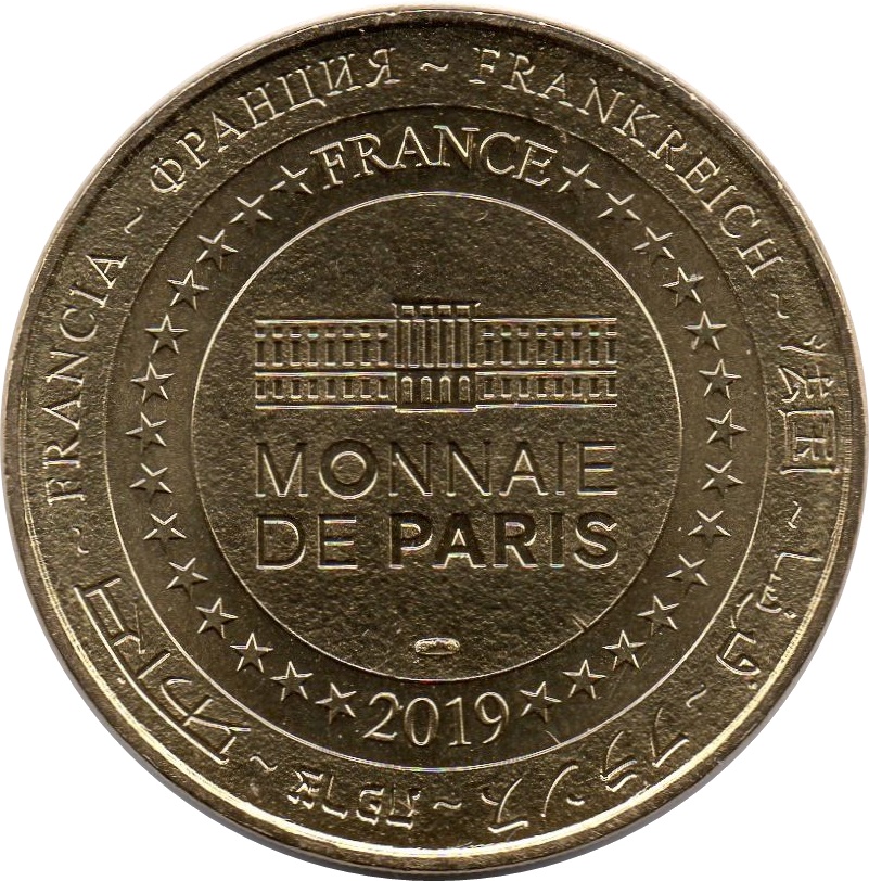 Опис: На периферії слово «Франція» написано вісьмома мовами. Франція на 12-й годині, 2019 рік на 6-й годині, все пов'язане 14 зірками праворуч і ліворуч. У центрі — будівля Монетного двору Парижа.
