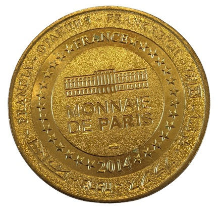 Опис: На периферії слово «Франція» написано вісьмома мовами. Франція на 12-й годині, 2014 рік на 6-й годині, все пов'язане 14 зірками праворуч і ліворуч. У центрі — будівля Моне де Парі.