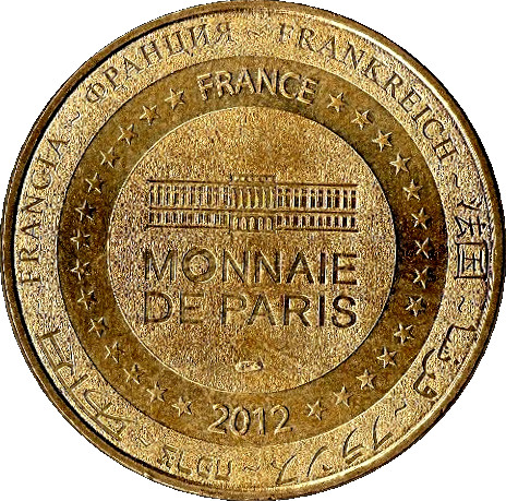 Опис: На периферії слово «Франція» написано вісьмома мовами. Франція на 12-й годині, 2012 рік на 6-й годині, все пов'язане 14 зірками праворуч і ліворуч. У центрі — будівля Моне-де-Парі.