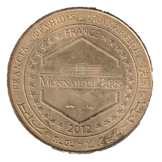 Опис: На периферії слово «Франція» написано вісьмома мовами. Франція на 12-й годині, 2012 рік на 6-й годині, все пов'язано 14 зірками праворуч і ліворуч. У центрі — будівля Monnaie de Paris у шестикутнику.