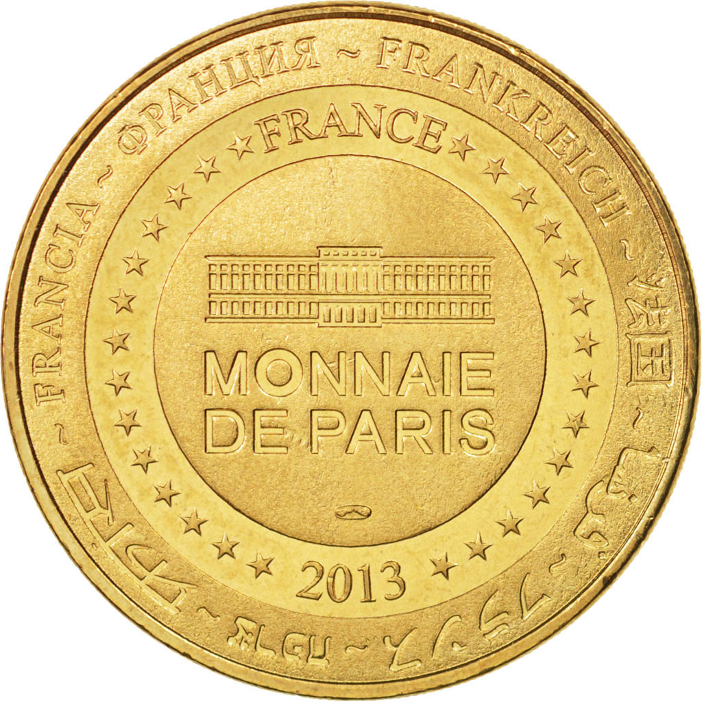 Опис: На периферії слово «Франція» написано вісьмома мовами. Франція на 12-й годині, 2013 рік на 6-й годині, все пов'язане 14 зірками праворуч і ліворуч. У центрі — будівля Моне-де-Парі.
