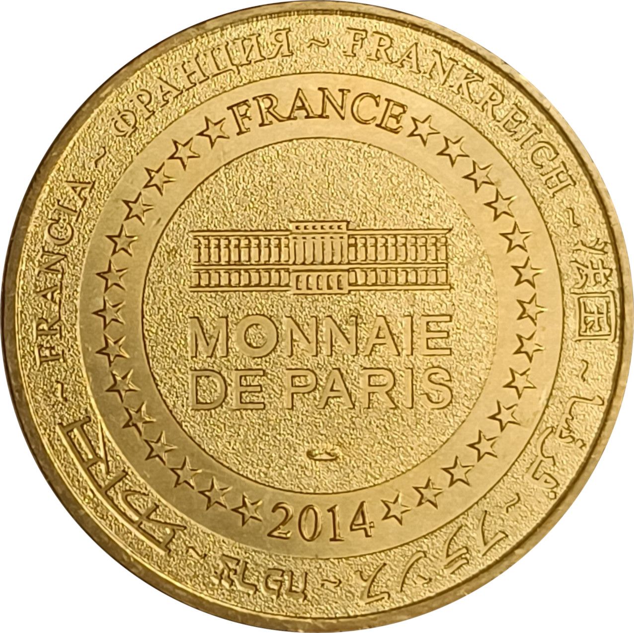 Опис: На периферії слово «Франція» написано вісьмома мовами. Франція на 12-й годині, 2014 рік на 6-й годині, все пов'язане 14 зірками праворуч і ліворуч. У центрі — будівля Моне де Парі. Слово «PARIS» має бути видовженим для випуску 2014 року.