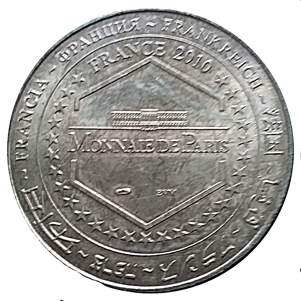 Опис: На периферії слово «Франція» написано вісьмома мовами. Коло, утворене написом «France 2010» на 12-й годині та 27 зірками. У центрі — будівля Монетного двору Парижа у формі шестикутника.