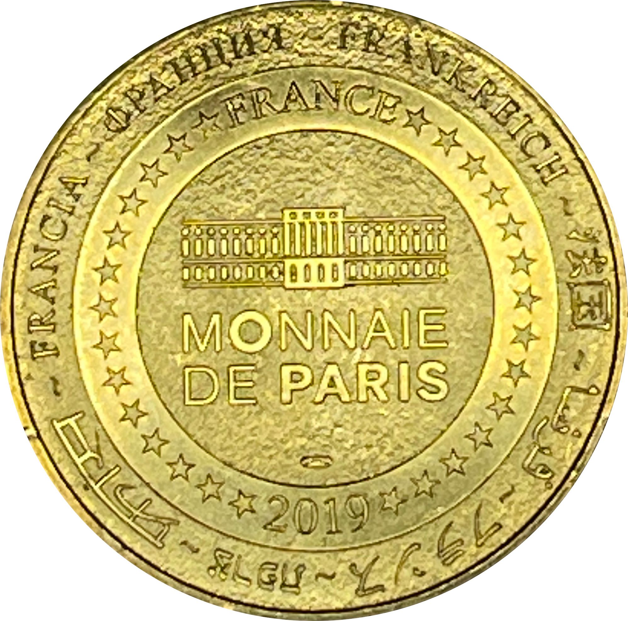 Опис: На периферії слово «Франція» написано вісьмома мовами. Франція на 12-й годині, 2019 рік на 6-й годині, все пов'язане 14 зірками праворуч і ліворуч. У центрі — будівля Монетного двору Парижа.