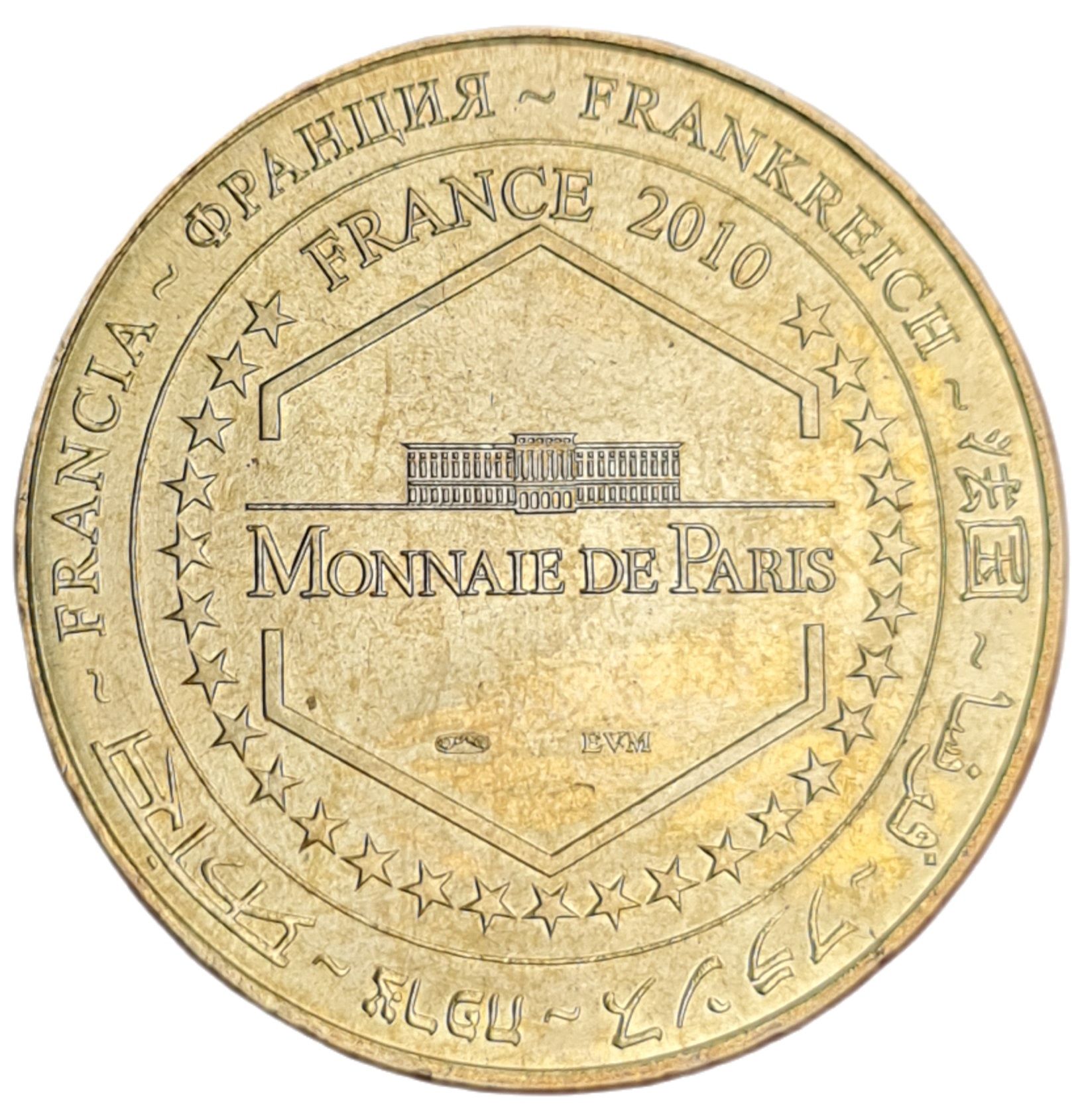 Опис: На периферії слово «Франція» написано вісьмома мовами. Коло, утворене написом «France 2010» на 12-й годині та 27 зірками. У центрі — будівля Монетного двору Парижа у формі шестикутника.