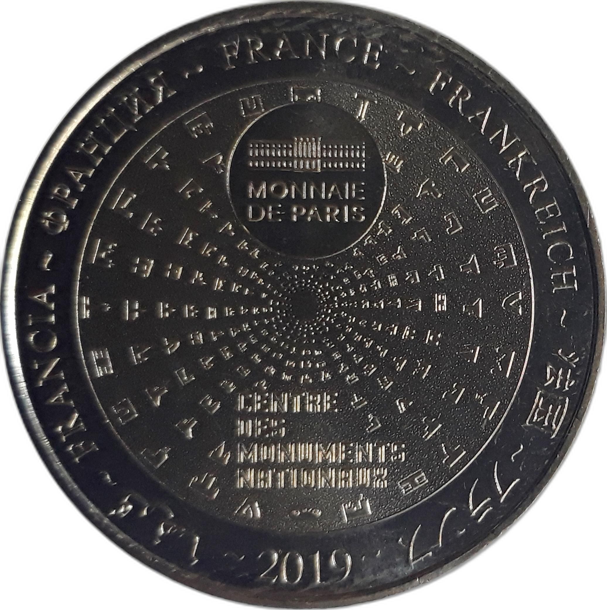 Опис: На периферії слово «Франція» написано сімома мовами. На 12-й годині — будівля Monnaie de Paris. Різні піктограми Centre des Monuments Nationaux сходяться до центру.