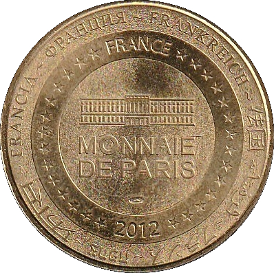 Опис: На периферії слово «Франція» написано вісьмома мовами. Франція на 12-й годині, 2012 рік на 6-й годині, все пов'язане 14 зірками праворуч і ліворуч. У центрі — будівля Моне де Парі.