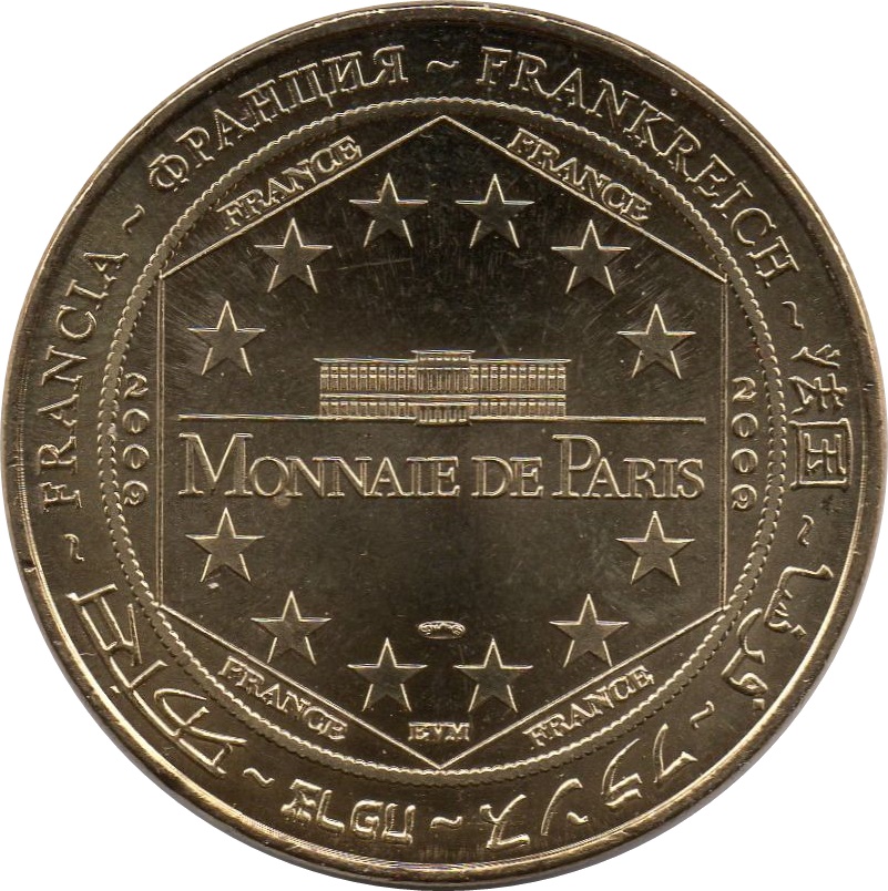 Опис: На периферії слово «Франція» написано вісьмома мовами. Франція у верхній і нижній частинах шестикутника, рік праворуч і ліворуч. У центрі — будівля Monnaie de Paris з 6 зірками зверху і знизу.