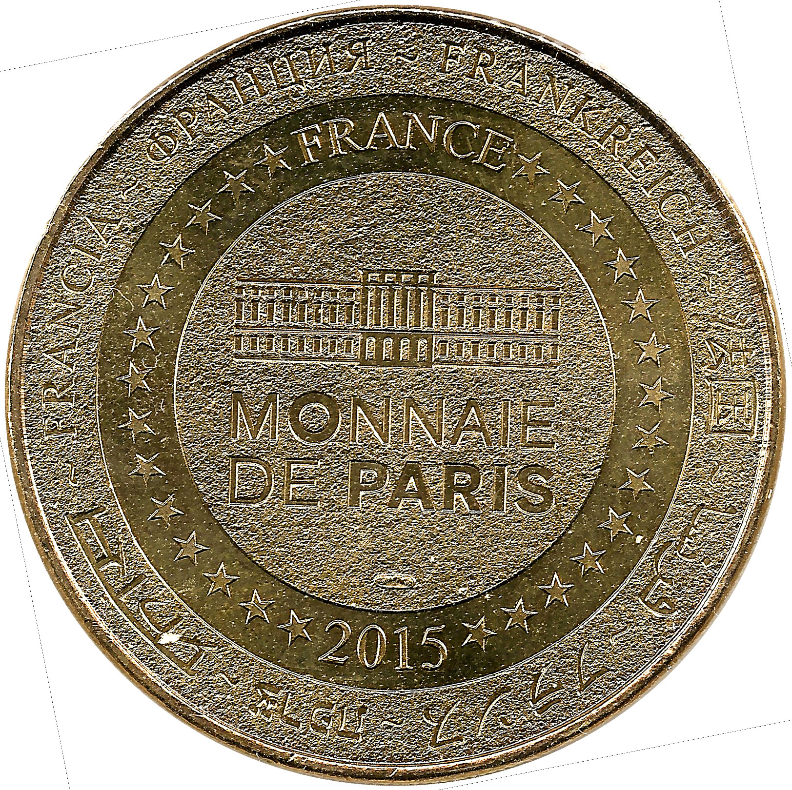 Опис: На периферії слово «Франція» написано вісьмома мовами. Франція на 12-й годині, 2015 рік на 6-й годині, все пов'язане 14 зірками праворуч і ліворуч. У центрі — будівля Монетного двору Парижа.