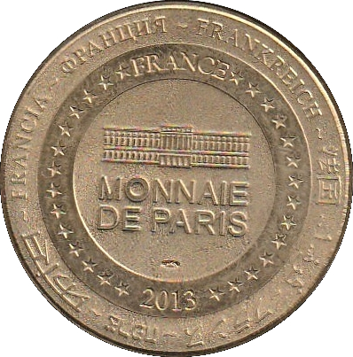 Опис: На периферії слово «Франція» написано вісьмома мовами. Франція на 12-й годині, 2013 рік на 6-й годині, все пов'язане 14 зірками праворуч і ліворуч. У центрі — будівля Моне-де-Парі.