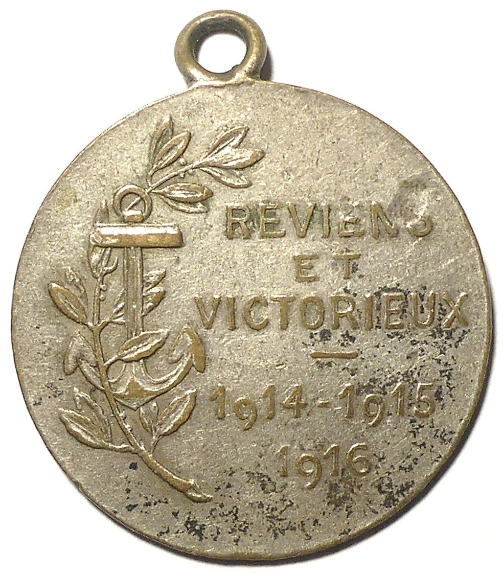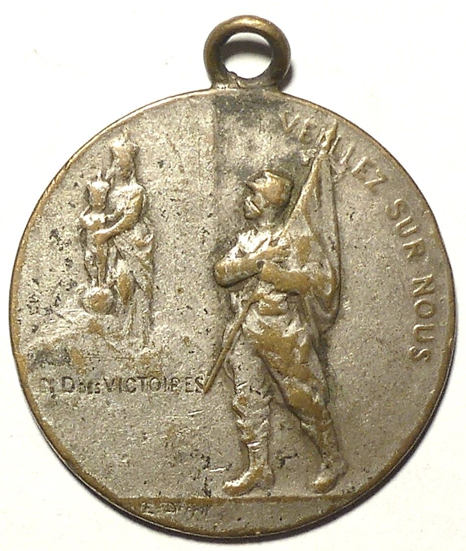 Опис: Солдат у формі стоїть ліворуч, тримаючи прапор над серцем, перед статуєю Нотр-Дам-де-Віктуар. Напис складається з двох частин: перша — під статуєю, друга — від 12 до 3 годин; нижче — підпис.