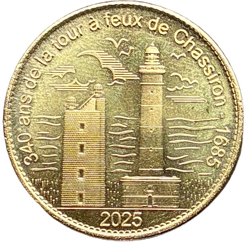 Опис: Маяк Шассірон на компасній троянді. На задньому плані три хвилі, що символізують Атлантичний океан.