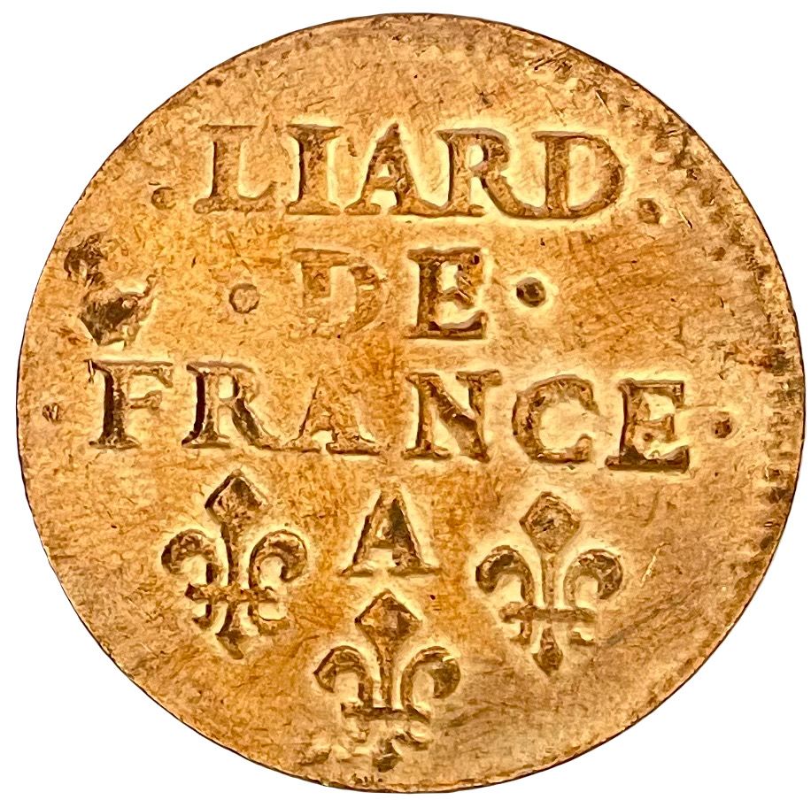 Опис: Репродукція французької ліарди з бюстом юнака, випущена в 1656 році в майстерні в Парижі, з типовими для цього типу монет недоліками карбування. За бюстом видно іншу монету, викарбувану в Парижі.