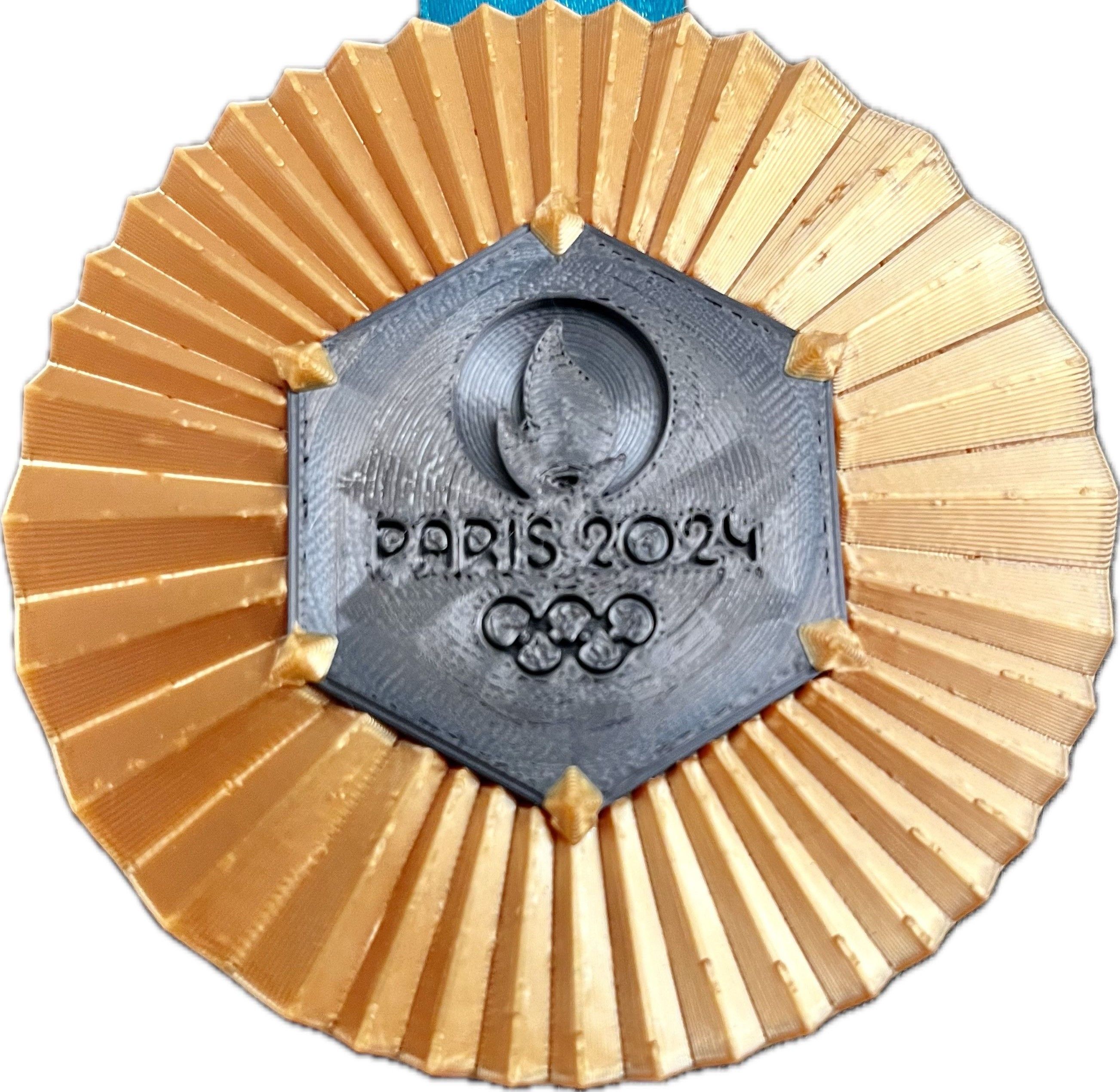 Опис: Кругла, золотого кольору, з темно-сірим шестикутником посередині. У шестикутнику розміщено логотип Олімпійських ігор 2024 року в Парижі. Шестикутник прикріплений шістьма відростками. Від центру до периферії проходять тонкі променисті лінії. Прикріплена стрічка бірюзового кольору.