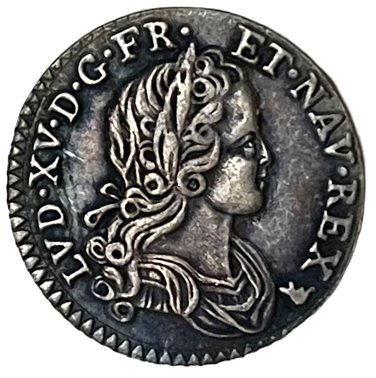 Опис: Молодий бюст короля Людовика XV праворуч, у лавровому вінку та обладунках, зображений у три чверті спереду.