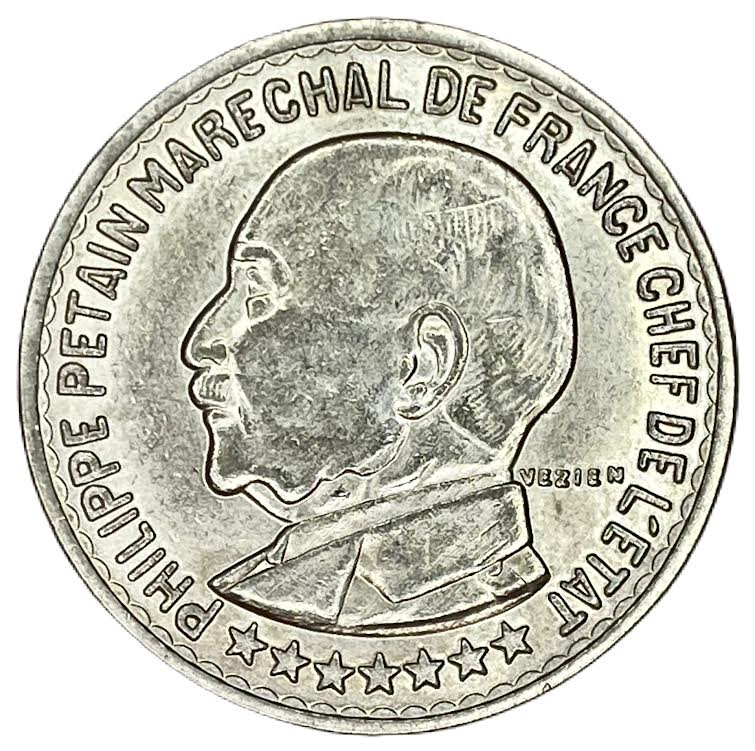 Опис: Зліва — оголена голова маршала Петен, нижче — сім зірок, а за потилицею — підпис гравера.
