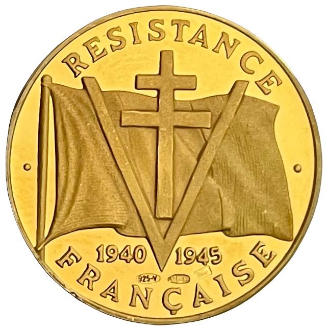 Опис: Крест Лотарингії та літера V на тлі французького прапора. Гарантійні клейма