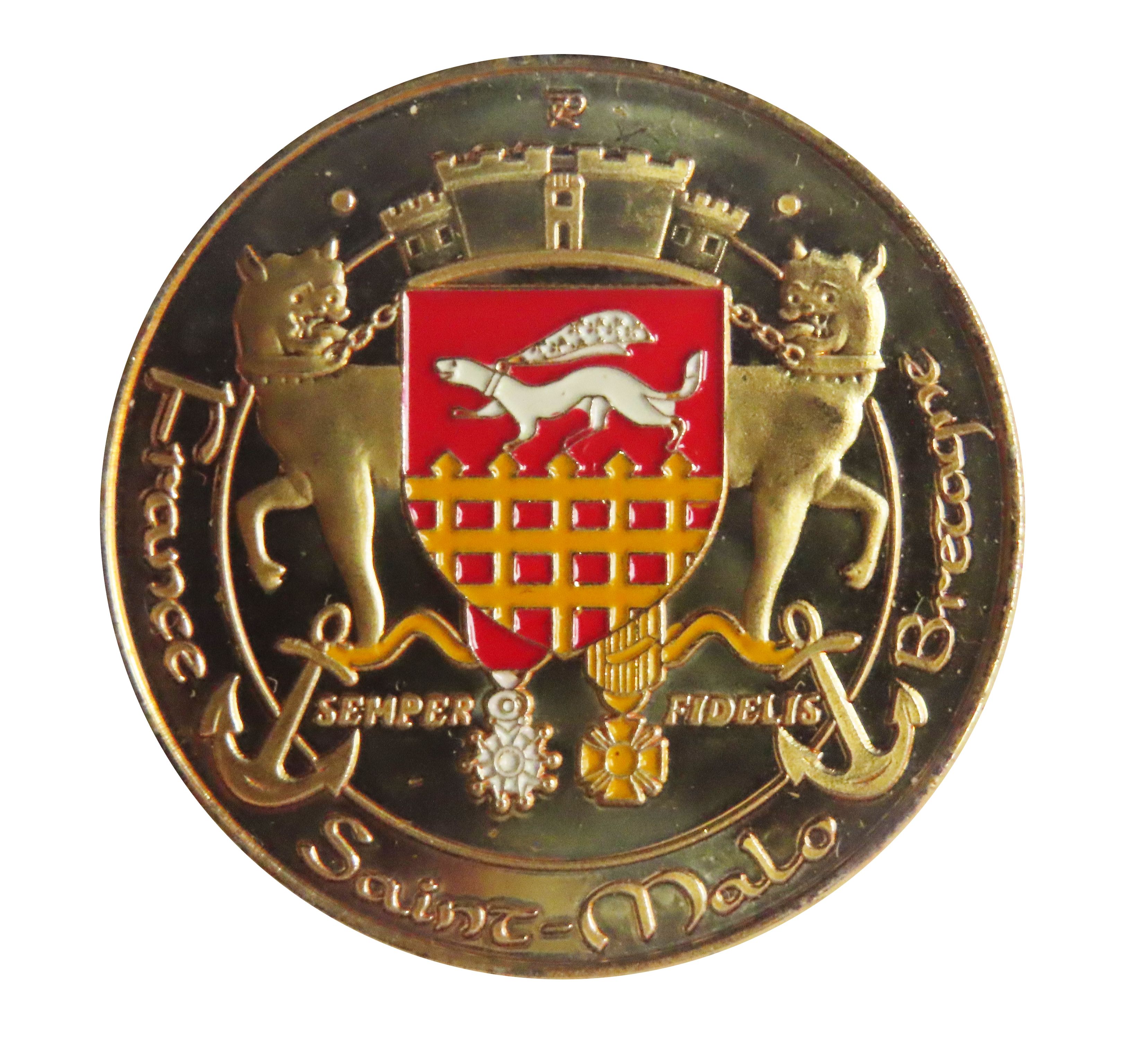Опис: (fr) Герб та цитадель Сен-Мало в обрамленні герменів та почесних відзнак. Герб має інший колір. Девіз міста: Semper Fidelis.