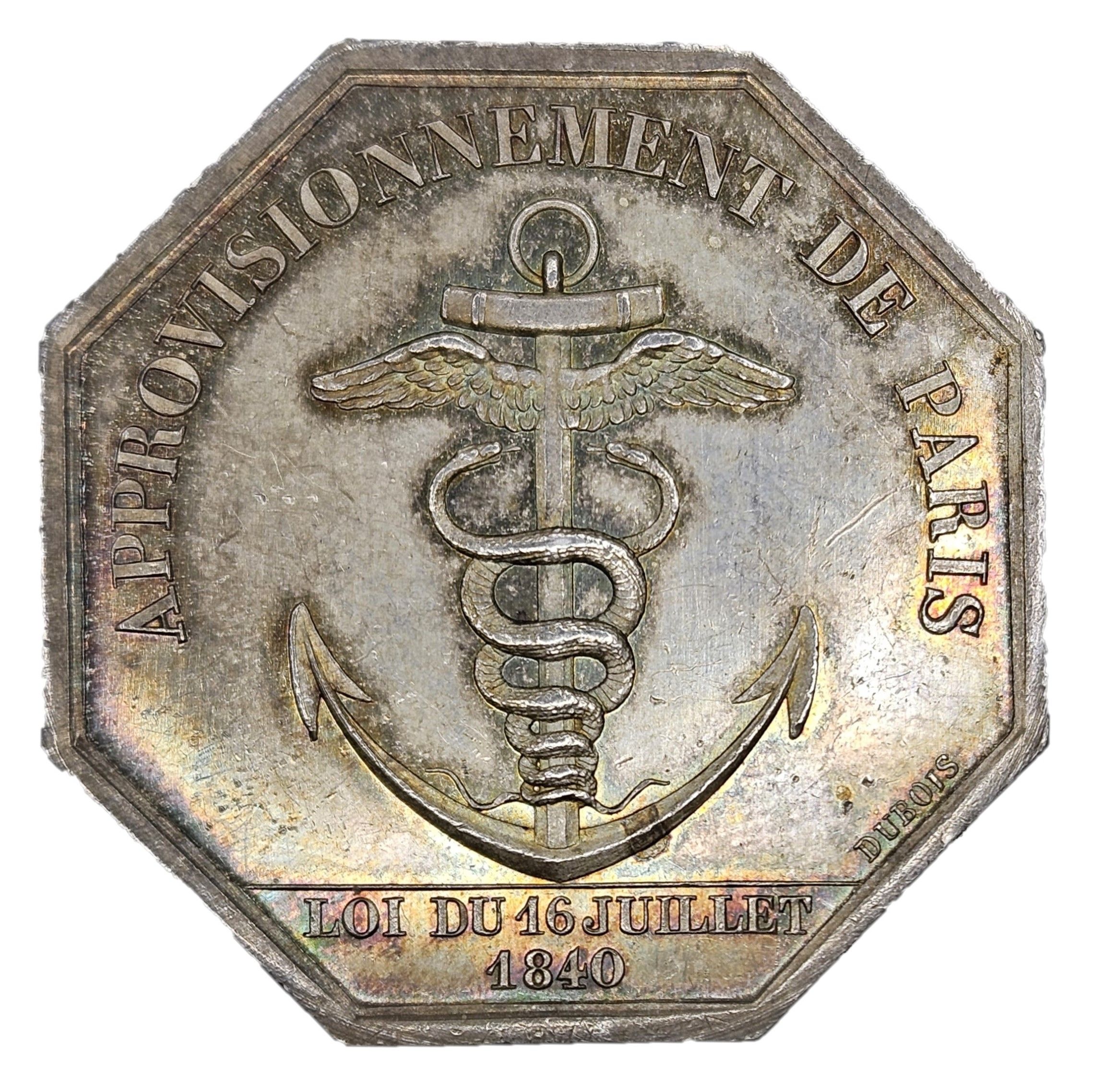 Опис: Кадуцей у поєднанні з якорем (морська торгівля), оточений написом, ім'ям гравера та датою.