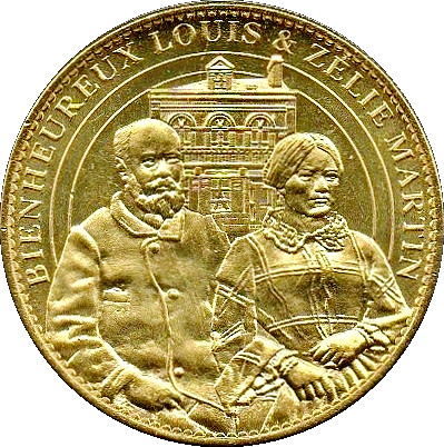 Опис: Текст по периферії. На передньому плані — портрет подружжя Мартінів, батьків Сент-Терез де Лізьє, французької комуни в департаменті Калвадос, регіон Нормандія.