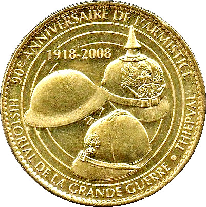 Опис: Текст по периферії. Зліва зображено англійський шолом, праворуч і знизу — німецький шолом із шипами, а також французький шолом часів війни 1914–1918 років. Пам'ятна медаль, випущена в меморіалі Тіпваль в Атюї, французькій комуні департаменту Сомма, регіону О-де-Франс.