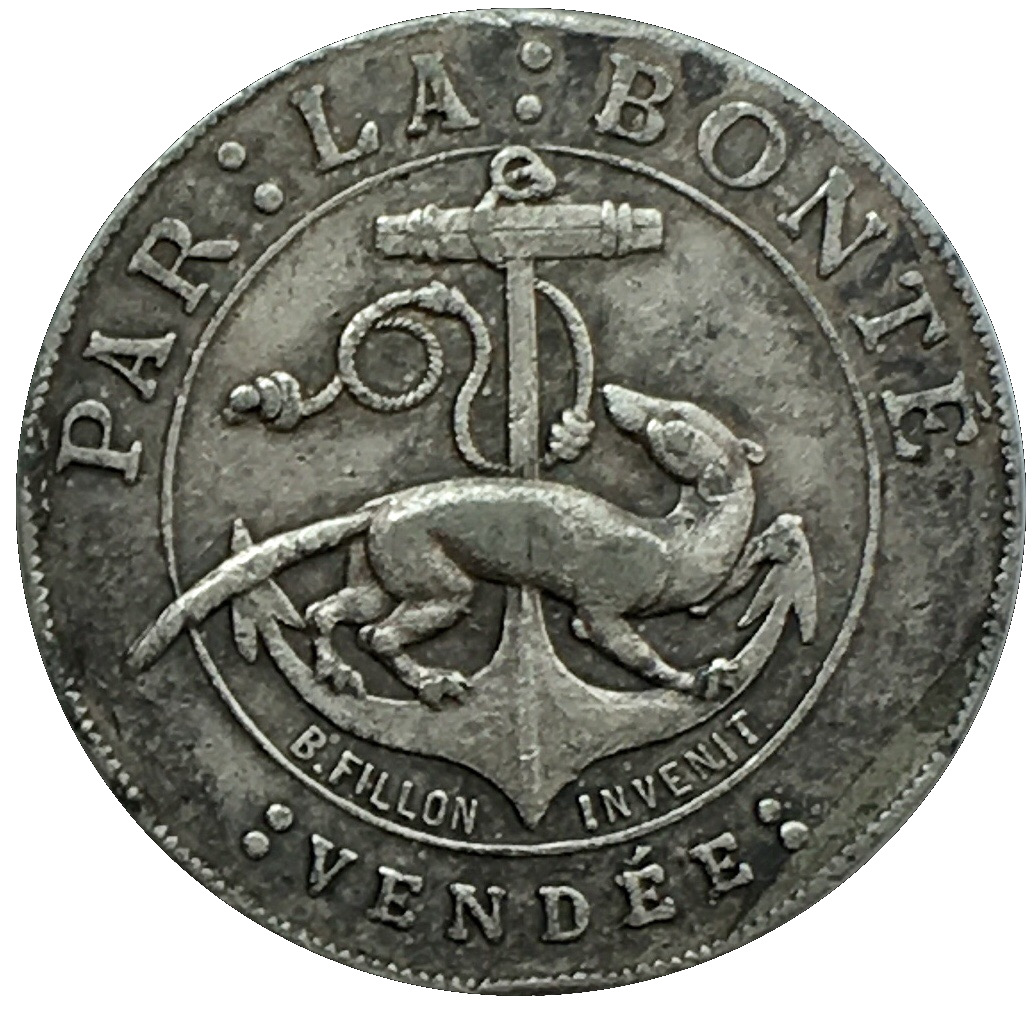 Опис: У центрі зображено горностая, що відпочиває на морському якорі (герб Бейлі дю Пон).