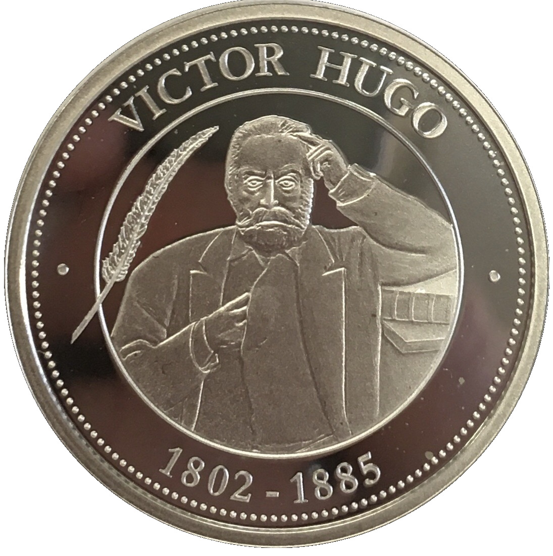 Опис: Портрет Віктора Гюго, французького поета, письменника та романтичного карикатуриста, що спирається на книги. Біля нього лежить перо. Дати народження та смерті