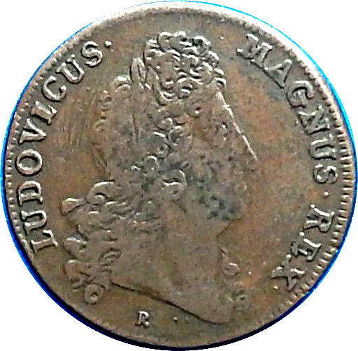 Опис: Погруддя короля Людовика XIV у лавровому вінку, з довгою кучерявою перукою, звернене вправо (стара голова). Зубчастий бордюр. Ініціали гравера «R» під обрізаною шиєю.