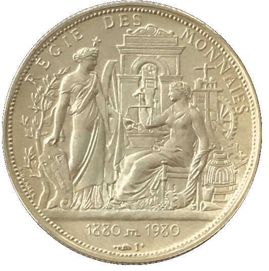 Опис: Зображено двох жінок, одягнених в античному стилі (Республіка та Адміністрація). Жінка, що стоїть, тримає в правій руці щит RF з ліктором. Жінка, що сидить, тримає в правій руці ваги/требушет, а в лівій — ріг достатку. За ними — тріумфальна арка та щось схоже на монетний двір.