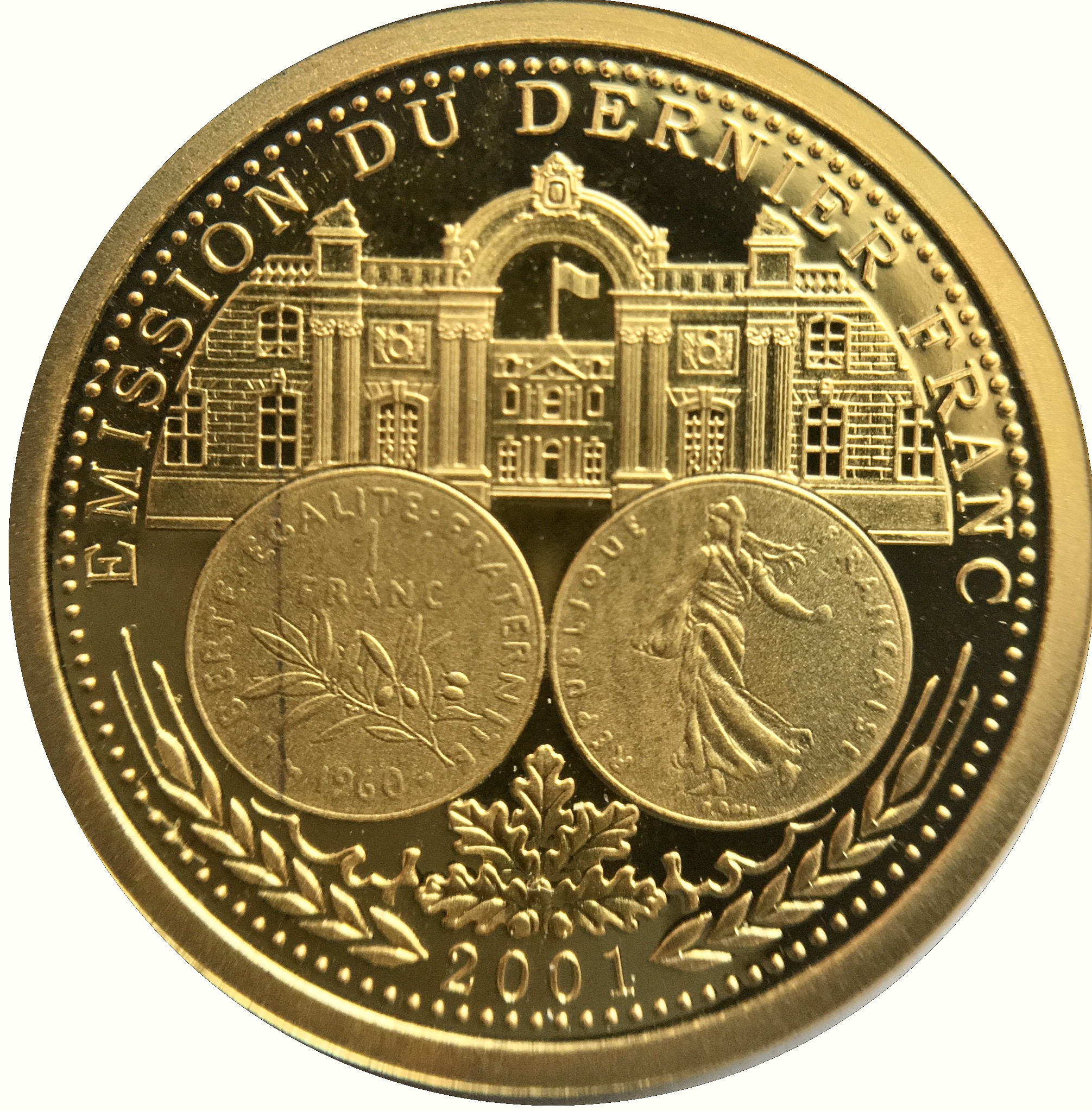 Опис: Аверс і реверс монети номіналом 1 франк «Semeuse» авторства Оскара Роті; зверху — вид на вхід до Єлисейського палацу та його почесний двір з вулиці Фобур-Сен-Оноре з прапором, що майорить; знизу — дубове листя, жолуді та колоски пшениці, що оточують 2001 рік, останній рік існування франка.