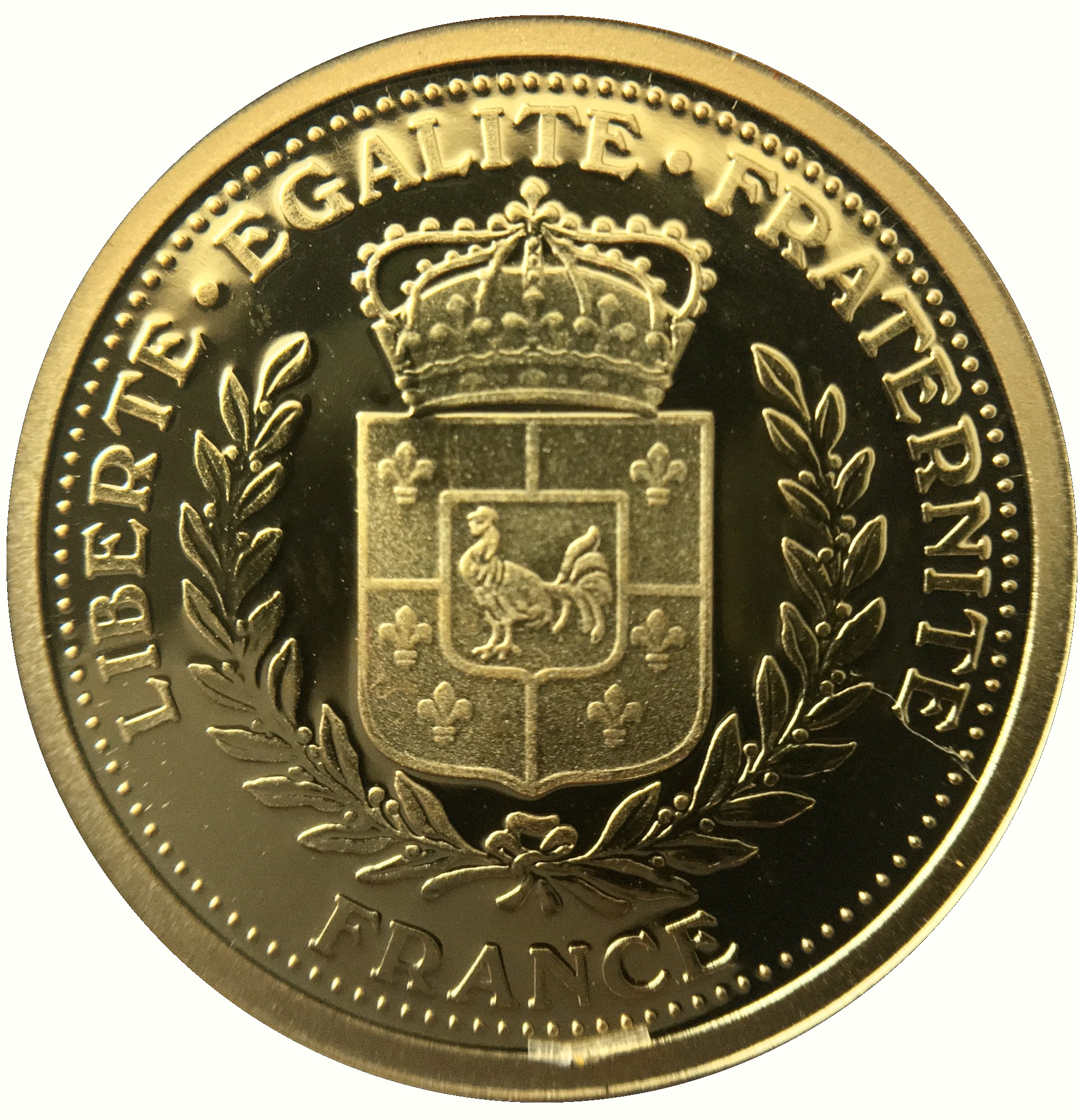 Опис: Французький герб із зображенням півня та лілії, увінчаних короною. Гілки лавра.