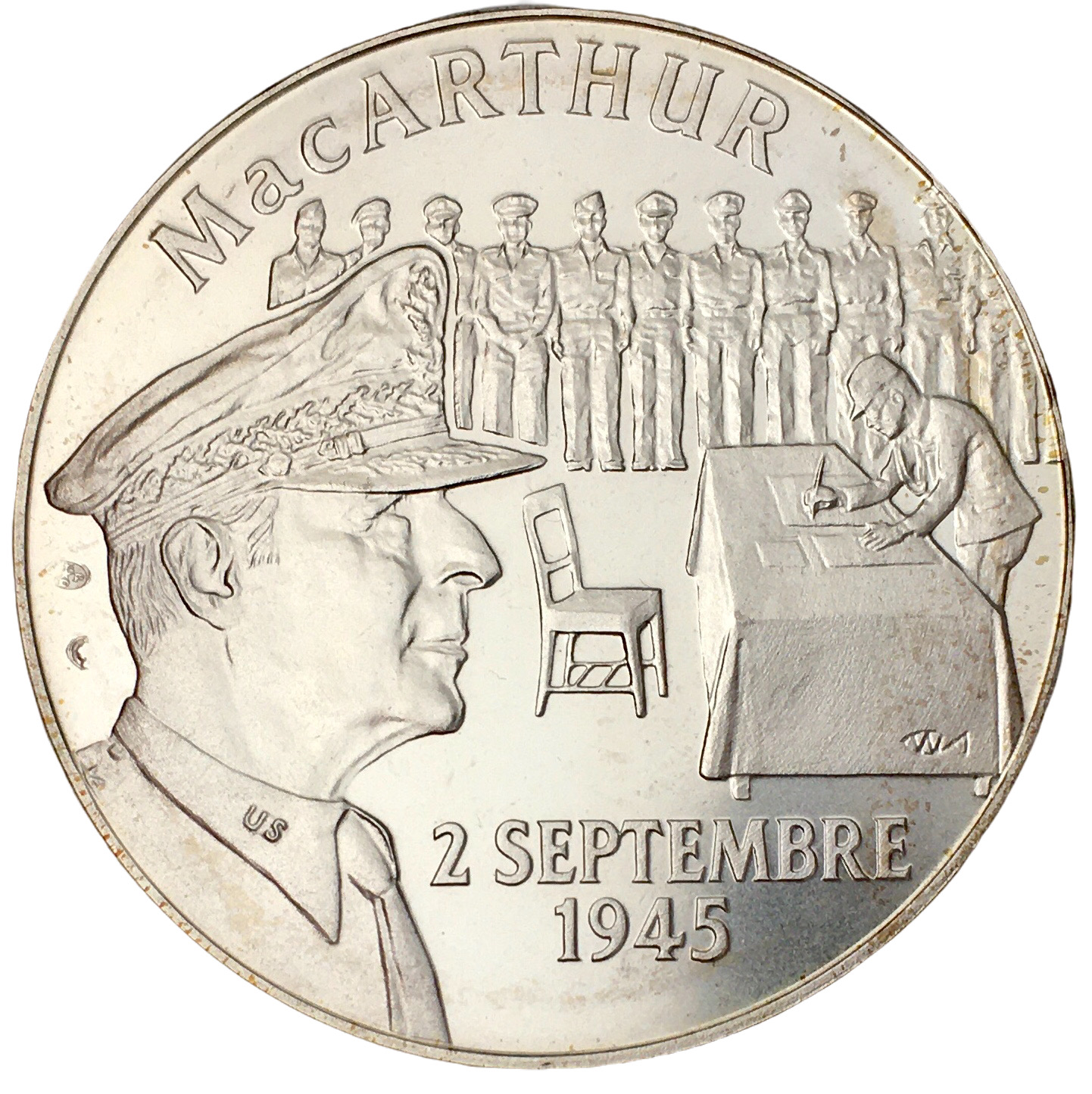 Опис: Профільний бюст генерала Дугласа Макартура та сцена підписання документів про капітуляцію Японії.