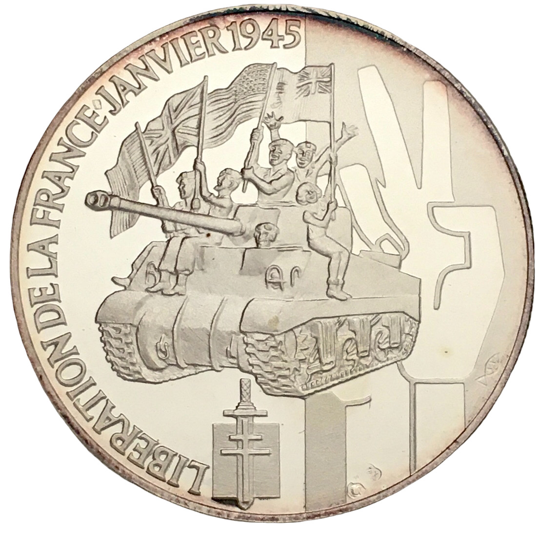 Опис: У центрі — платформа з людьми, які тримають прапори союзників. Праворуч — руки, що утворюють букву V, яка означає перемогу. Внизу — медаль Croix de la Libération. Клеймо Мінерви.
