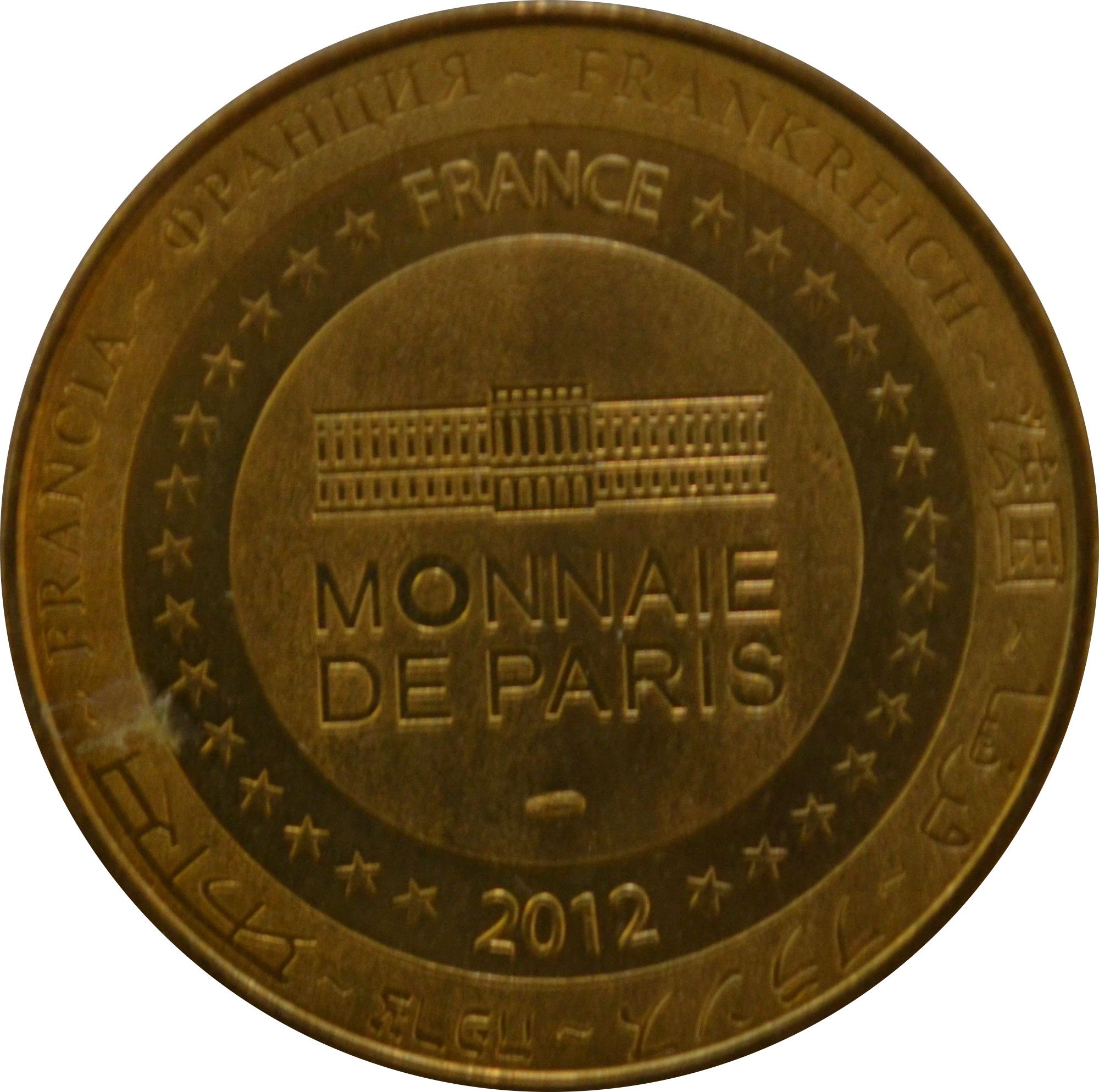 Опис: На периферії слово «Франція» написано вісьмома мовами. Франція на 12-й годині, 2012 рік на 6-й годині, все пов'язане 14 зірками праворуч і ліворуч. У центрі — будівля Монетного двору Парижа.