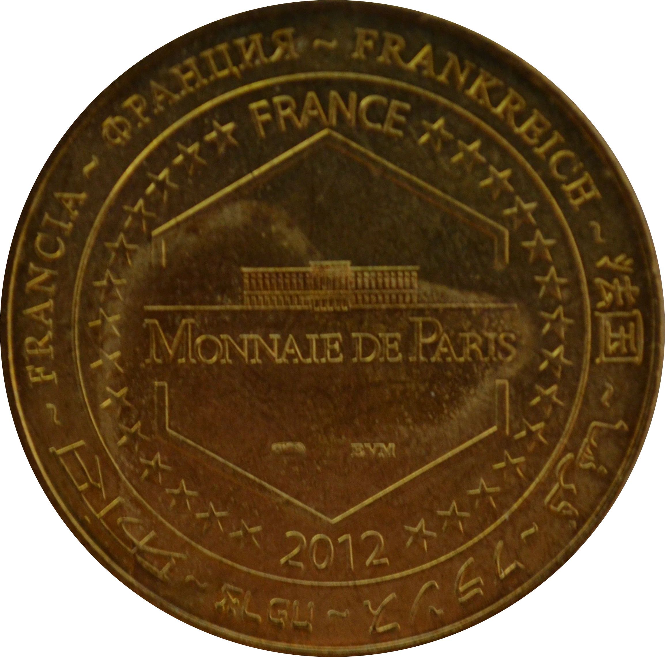 Опис: На периферії слово «Франція» написано вісьмома мовами. Франція на 12-й годині, 2012 рік на 6-й годині, все пов'язано 14 зірками праворуч і ліворуч. У центрі — будівля Monnaie de Paris у шестикутнику.
