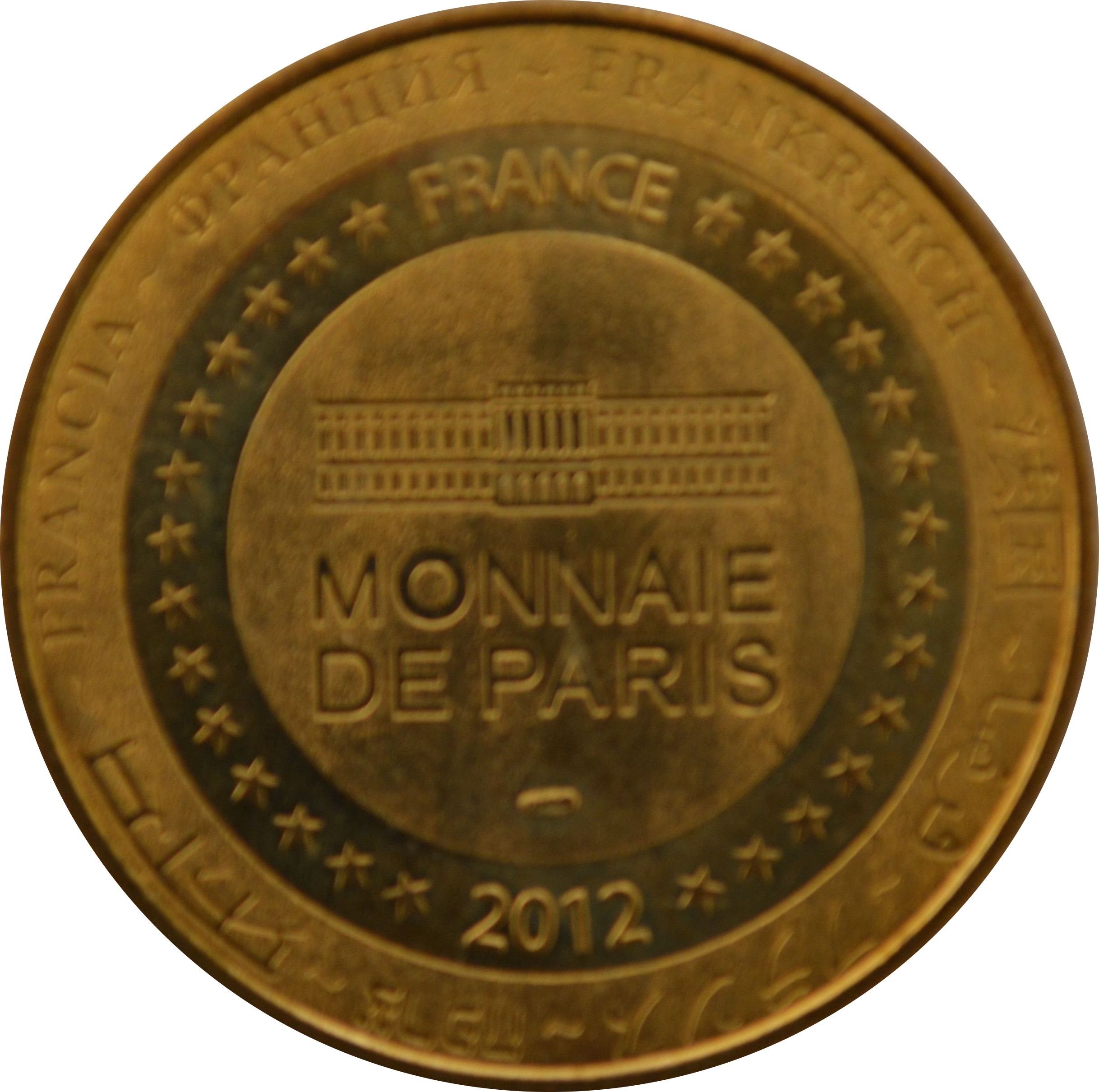Опис: На периферії слово «Франція» написано вісьмома мовами. Франція на 12-й годині, 2012 рік на 6-й годині, все пов'язане 14 зірками праворуч і ліворуч. У центрі — будівля Моне-де-Парі.