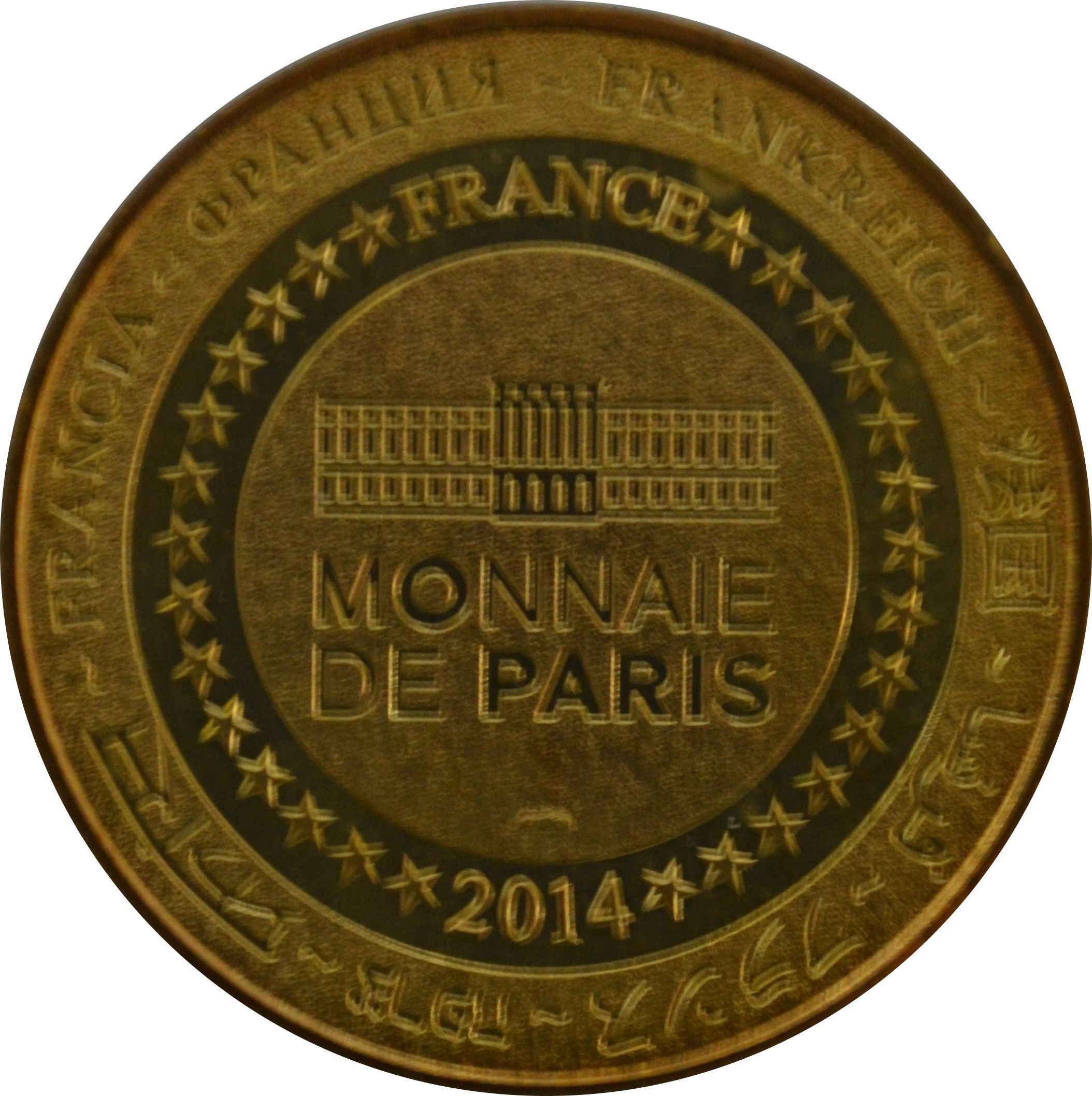 Опис: На периферії слово «Франція» написано вісьмома мовами. Франція на 12-й годині, 2014 рік на 6-й годині, все пов'язане 14 зірками праворуч і ліворуч. У центрі — будівля Моне де Парі.