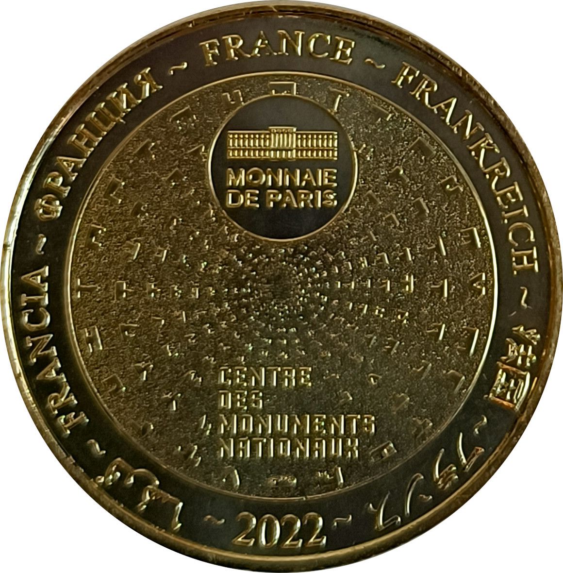 Опис: На периферії слово «Франція» написано шістьма мовами. На 12-й годині — будівля Monnaie de Paris. Піктограми Centre des Monuments Nationaux сходяться до центру.