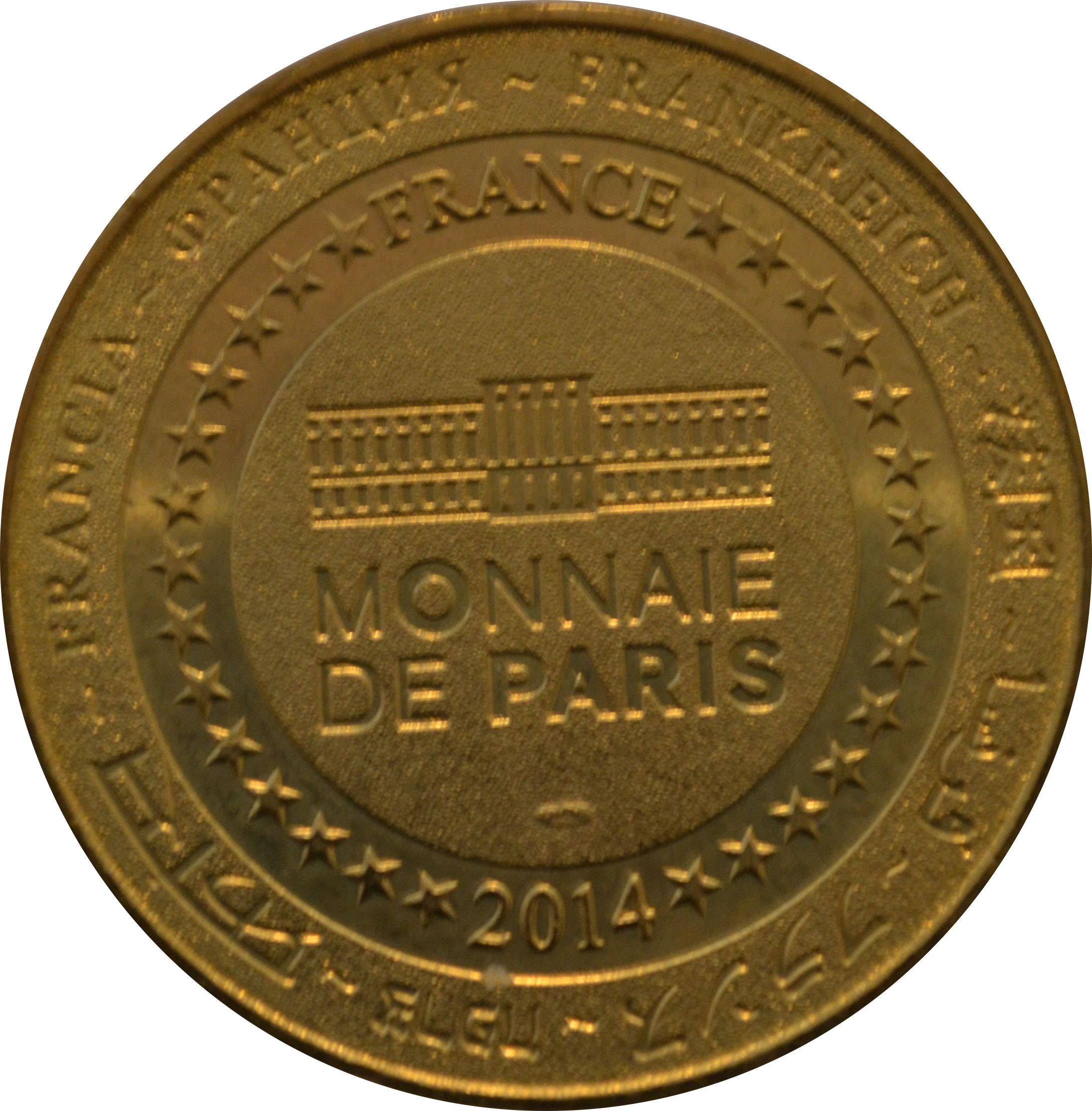 Опис: На периферії слово «Франція» написано вісьмома мовами. Франція на 12-й годині, 2014 рік на 6-й годині, все пов'язане 14 зірками праворуч і ліворуч. У центрі — будівля Моне де Парі.