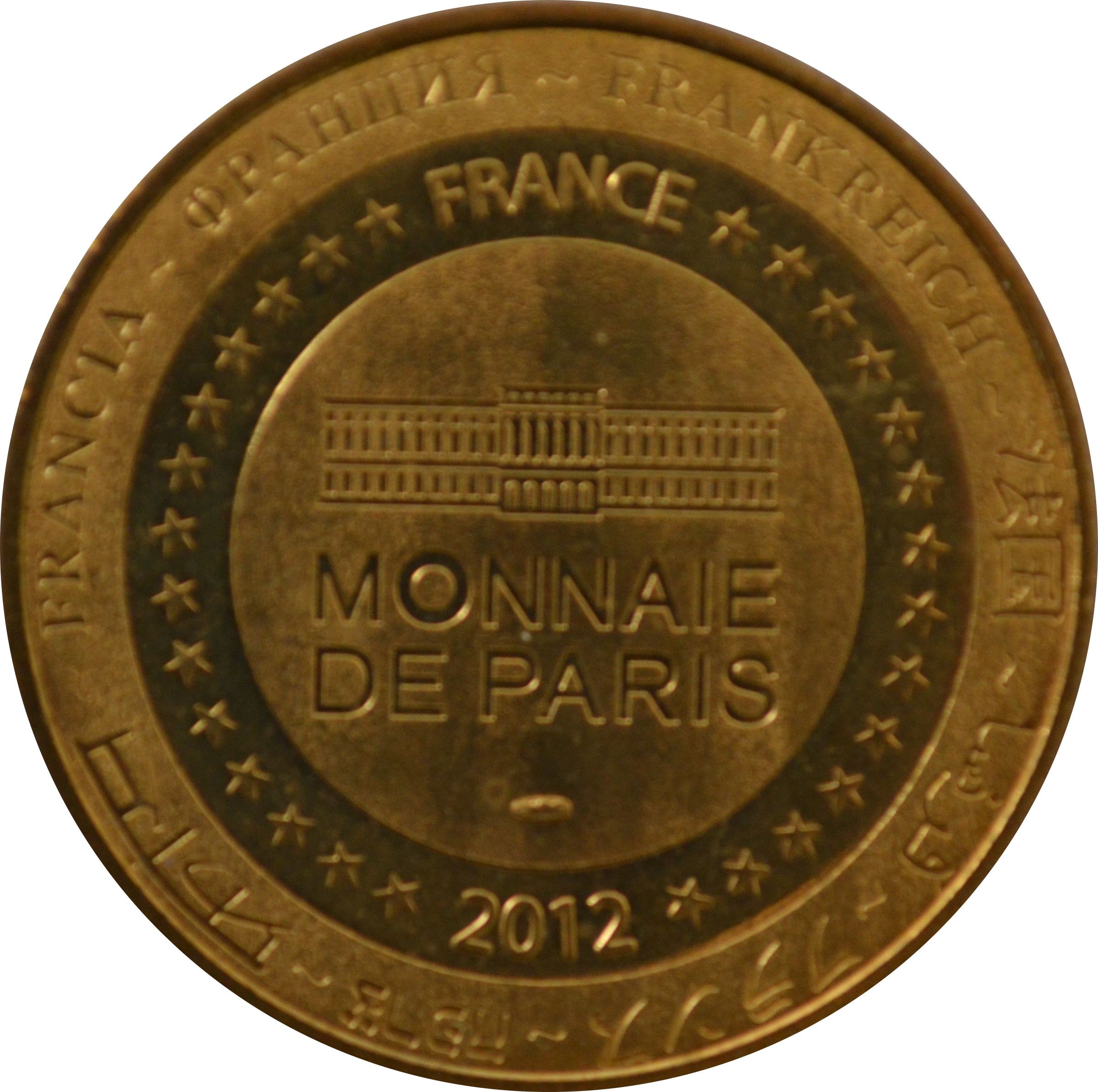 Опис: На периферії слово «Франція» написано вісьмома мовами. Франція на 12-й годині, 2012 рік на 6-й годині, все пов'язане 14 зірками праворуч і ліворуч. У центрі — будівля Монетного двору Парижа.