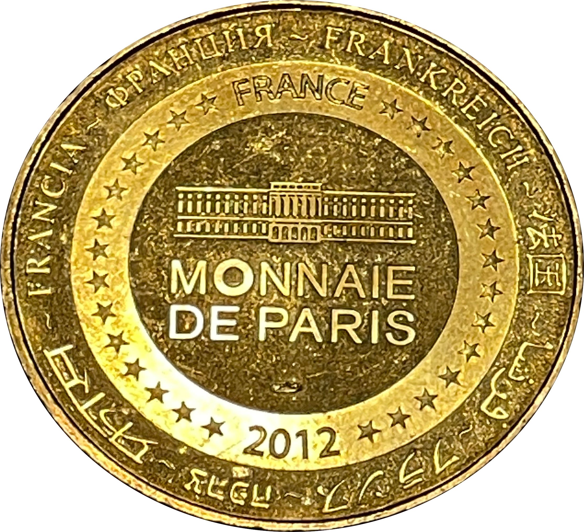 Опис: На периферії слово «Франція» написано вісьмома мовами. Франція на 12-й годині, 2012 рік на 6-й годині, все пов'язане 14 зірками праворуч і ліворуч. У центрі — будівля Моне де Парі.