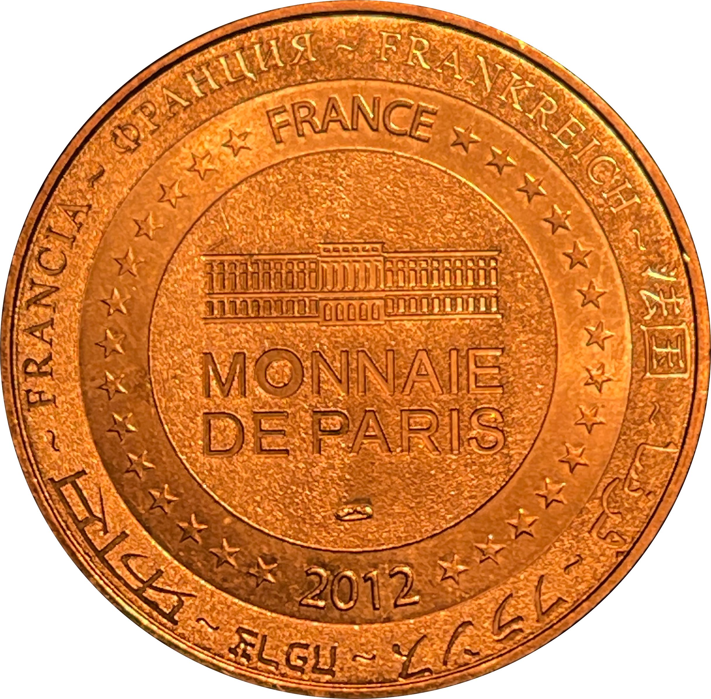 Опис: На периферії слово «Франція» написано вісьмома мовами. Франція на 12-й годині, 2012 рік на 6-й годині, все пов'язане 14 зірками праворуч і ліворуч. У центрі — будівля Монетного двору Парижа.
