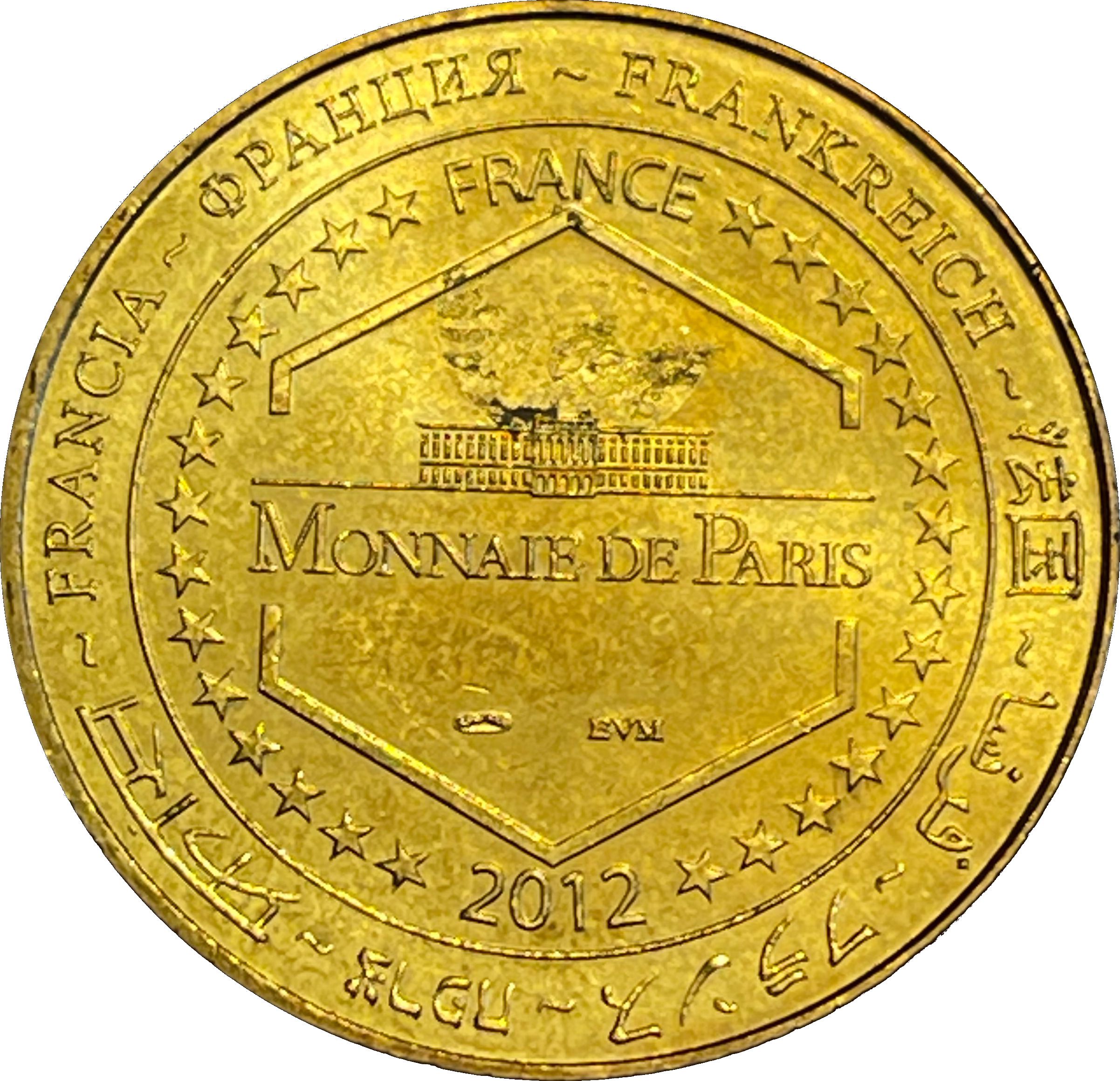 Опис: На периферії слово «Франція» написано вісьмома мовами. Франція на 12-й годині, 2012 рік на 6-й годині, все пов'язано 14 зірками праворуч і ліворуч. У центрі — будівля Monnaie de Paris у шестикутнику.